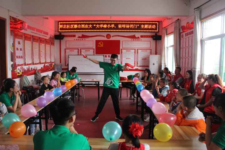 为了增加孩子们的诗词文化储备,丰富他们的学习生活,陕西省合阳县城关镇街道办环北社区的工作人员与av在线 2019暑期“三下乡”赴合阳县城关镇脱贫攻坚和振兴乡村服务队于7月17日下午3点在办事处会议室联合举办了名为“大手牵小手,轻叩诗词门”的主题活动。