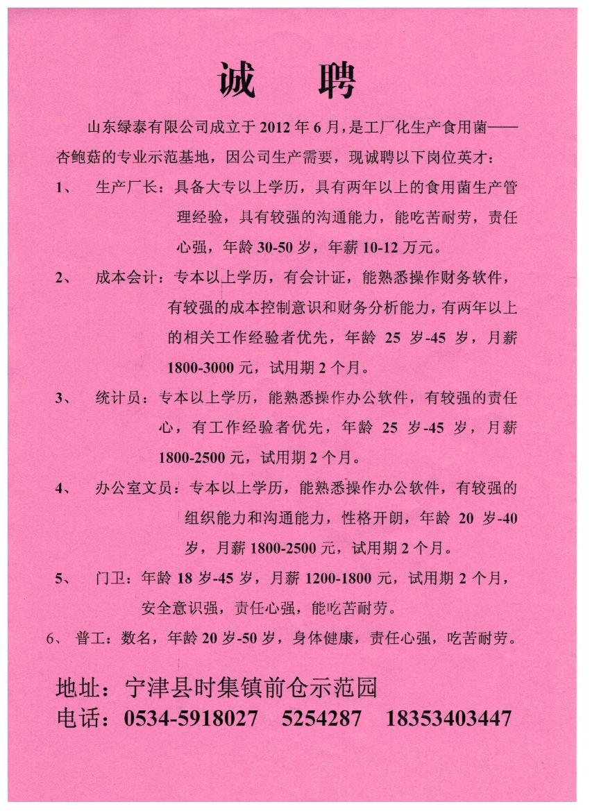 山东绿泰有限公司招聘简章